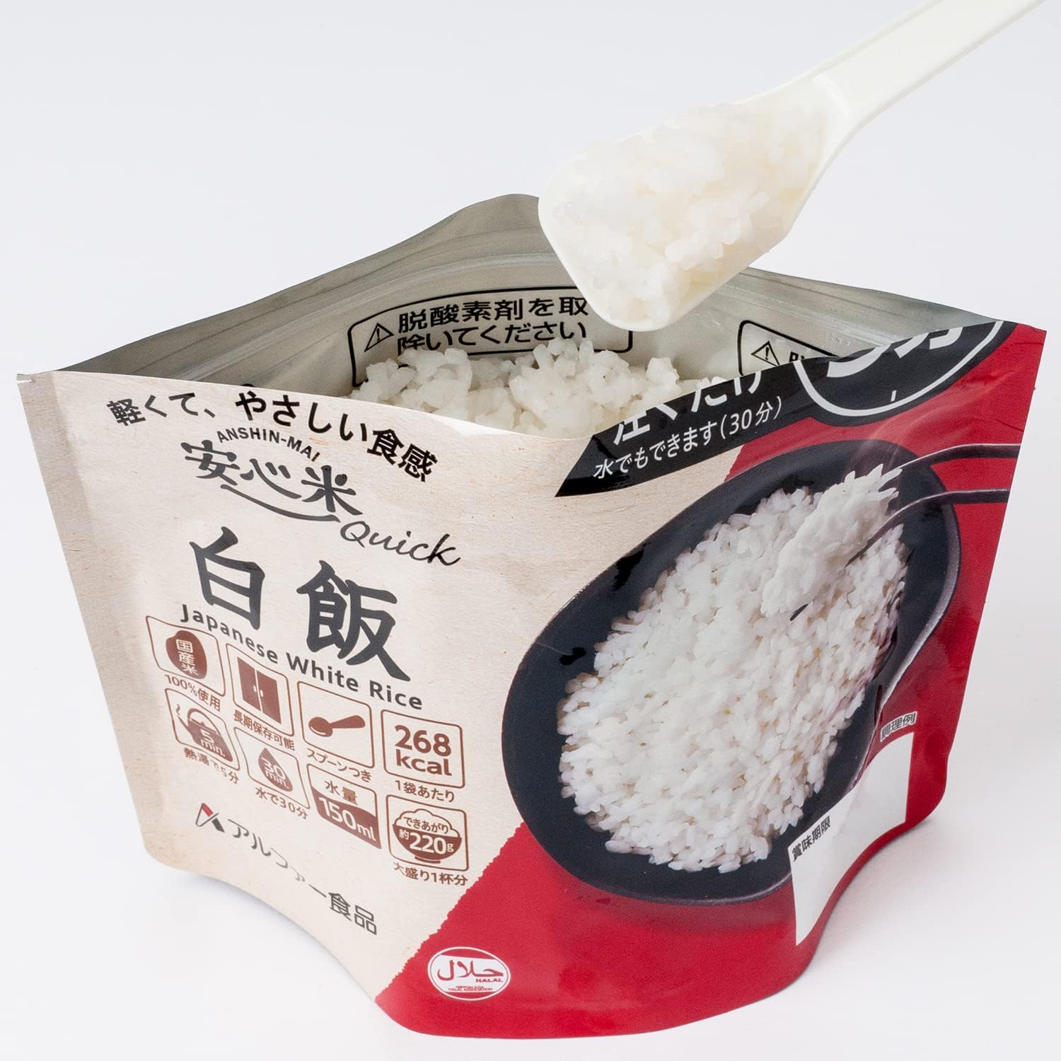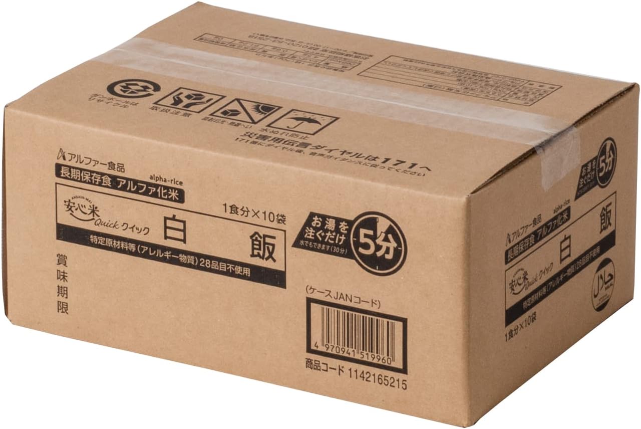 注入热水,5分钟! 用水也可以30分钟,比普通的阿尔法化米更早。 使用100%日本产粳米,轻便、口感柔和的紧急饭。 中间放入汤匙,袋子就会变成容器,可以直接食用。 保质期为生产日起5年以上,可长期保存。 轻便小巧,携带性优异,即使加入热水或水也不会倾倒的设计,推荐在户外、登山、旅行时使用。 也适合在露营用餐时使用。 不使用特定原材料(过敏物质)28种产品,是苯乙烯认证商品。