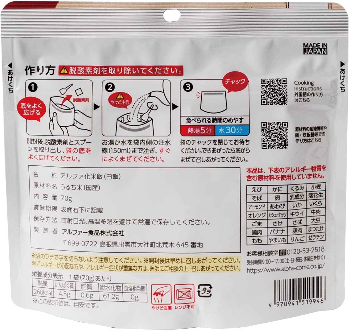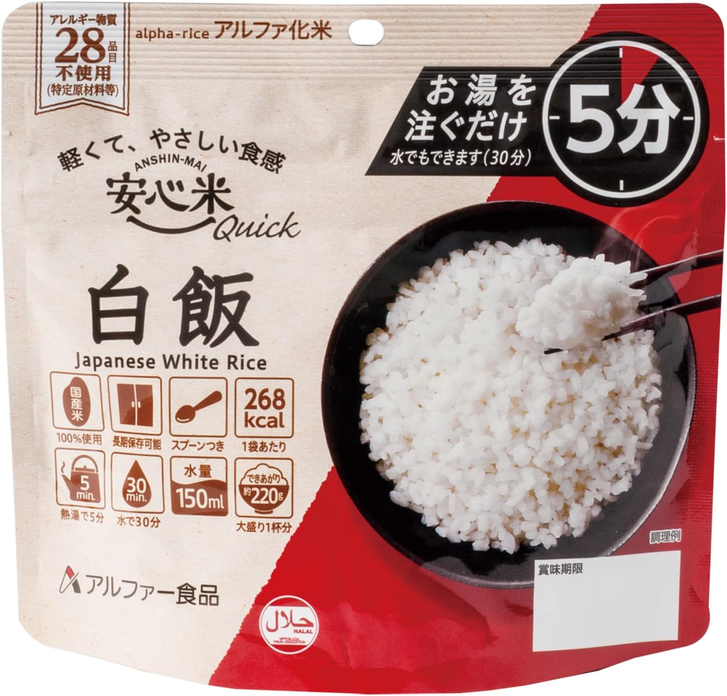 注入热水,5分钟! 用水也可以30分钟,比普通的阿尔法化米更早。 使用100%日本产粳米,轻便、口感柔和的紧急饭。 中间放入汤匙,袋子就会变成容器,可以直接食用。 保质期为生产日起5年以上,可长期保存。 轻便小巧,携带性优异,即使加入热水或水也不会倾倒的设计,推荐在户外、登山、旅行时使用。 也适合在露营用餐时使用。 不使用特定原材料(过敏物质)28种产品,是苯乙烯认证商品。